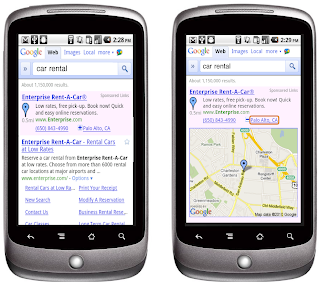 Publicidad en Google // Salir en Google // Anuncios en Google // Anunciarse en Google No era suficiente con mostrar millones de resultados en décimas de segundo... y vino Google Instant, resultados predictivos, "te mostramos los resultados antes de que finalices tu búsqueda". No era suficiente con mostrar anuncios locales, es decir, si buscas pizzerías en Valencia, mostramos anuncios de publicidad en Google de pizzerías en Valencia incluyendo mapa para llegar a la pizzería... y ahora lanzan los anuncios "hiperlocales" en los que además de mostrarte anuncios locales te dicen en tu teléfono móvil la distancia a la que se encuentran las empresas que ofrecen los productos o servicios que buscas. ¡¡Google Grande!! Imagine driving to work and your Check Engine light comes on. After pulling over and calling a tow truck, you realize you'll need another car to get to work and use while yours is getting repaired. You pull out your phone and search for "car rental," hoping that you can find one nearby. From a Google search ad result you discover there's an Enterprise Rent-A-Car neighborhood location just half a mile away! The blue distance marker made it easy to see that Enterprise is approximately .5 miles away. You click on the phone number listed in the ad and are instantly connected with the car rental service. Soon, an Enterprise representative is on his way to pick you up.